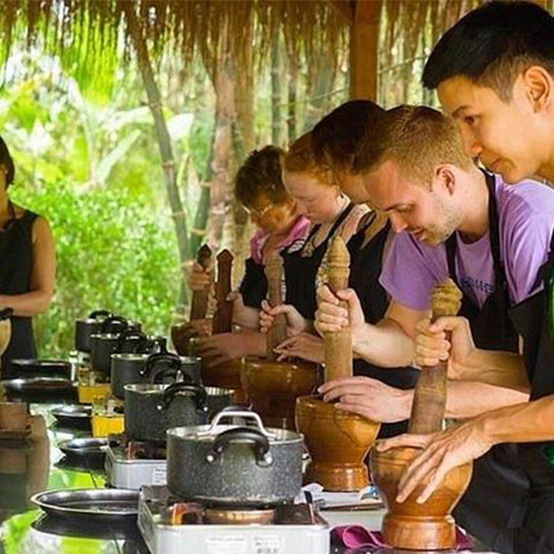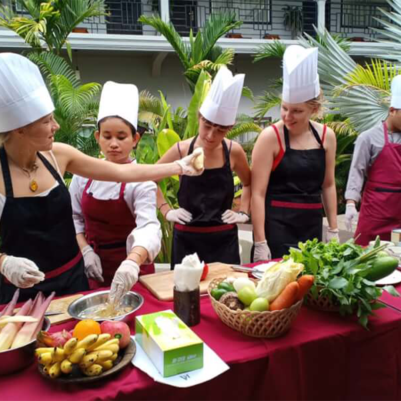 Departure from your hotel after breakfast with a trip of about 15 km from Siem Reap. Arrival at the local market in Pourk where the appointment with Mrs. Thavy to buy vegetables, freshwater fish, meat, spices. Then you will join the pretty traditional wooden house of this nice Cambodian family to prepare typical dishes. Then, accompanied by your hosts, you will go to the pagoda to make an offering of part of your culinary preparations. You will have the opportunity to live the unique experience of a Buddhist blessing. After a short chant, the monk will bless you with lustral water. This ritual, very popular among the Khmers, aims to chase away evil spirits, such as illness or bad luck! Back at Mrs. Theavy's, you will have lunch with the rest of the prepared dishes.
