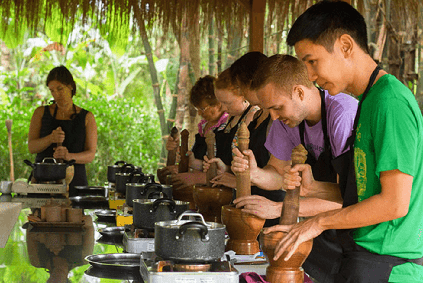 Departure from your hotel after breakfast with a trip of about 15 km from Siem Reap. Arrival at the local market in Pourk where the appointment with Mrs. Thavy to buy vegetables, freshwater fish, meat, spices. Then you will join the pretty traditional wooden house of this nice Cambodian family to prepare typical dishes. Then, accompanied by your hosts, you will go to the pagoda to make an offering of part of your culinary preparations. You will have the opportunity to live the unique experience of a Buddhist blessing. After a short chant, the monk will bless you with lustral water. This ritual, very popular among the Khmers, aims to chase away evil spirits, such as illness or bad luck! Back at Mrs. Theavy's, you will have lunch with the rest of the prepared dishes.