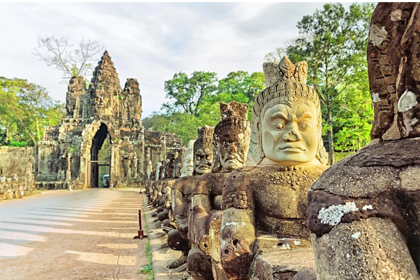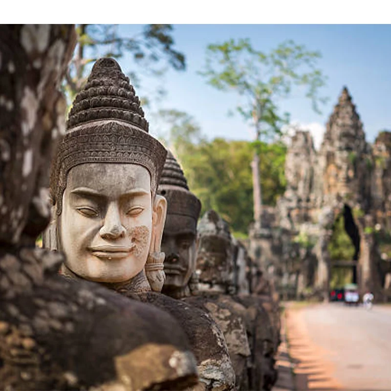 The South Gate of Angkor Thom: walk through a narrow alley guarded by 108 statues of smiling gods and fierce demons; the serene stone faces since the 12th century at the Bayon Temple, whose long bas-reliefs tell the spectacular story of Khmer victories over Cham warriors, then the richly decorated Terrace of the Leper King to the Terrace of the Elephants.