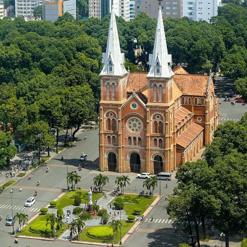 Fly to Ho Chi Minh City, Saigon, the largest Vietnamese city. There are street markets, sidewalk cafes and sleek new bars. This teeming metropolis offers 300 years of timeless traditions and the beauty of an ancient culture. To the west of the city is the huge Chinese neighborhood called Cholon, which means "Big Market." Notre Dame Cathedral, in the heart of Saigon's government quarter, is of neo- Romanesque architecture with two high square tower and iron spires. The Central Post Office is French-style and City Hall, known as "Hotel de Ville," is typical of the French architecture that would be seen in any village in France. Visit the War Remnants Museum, featuring collections of weapons and photographs from the two Indochina wars. Stay overnight in Ho Chi Minh City.